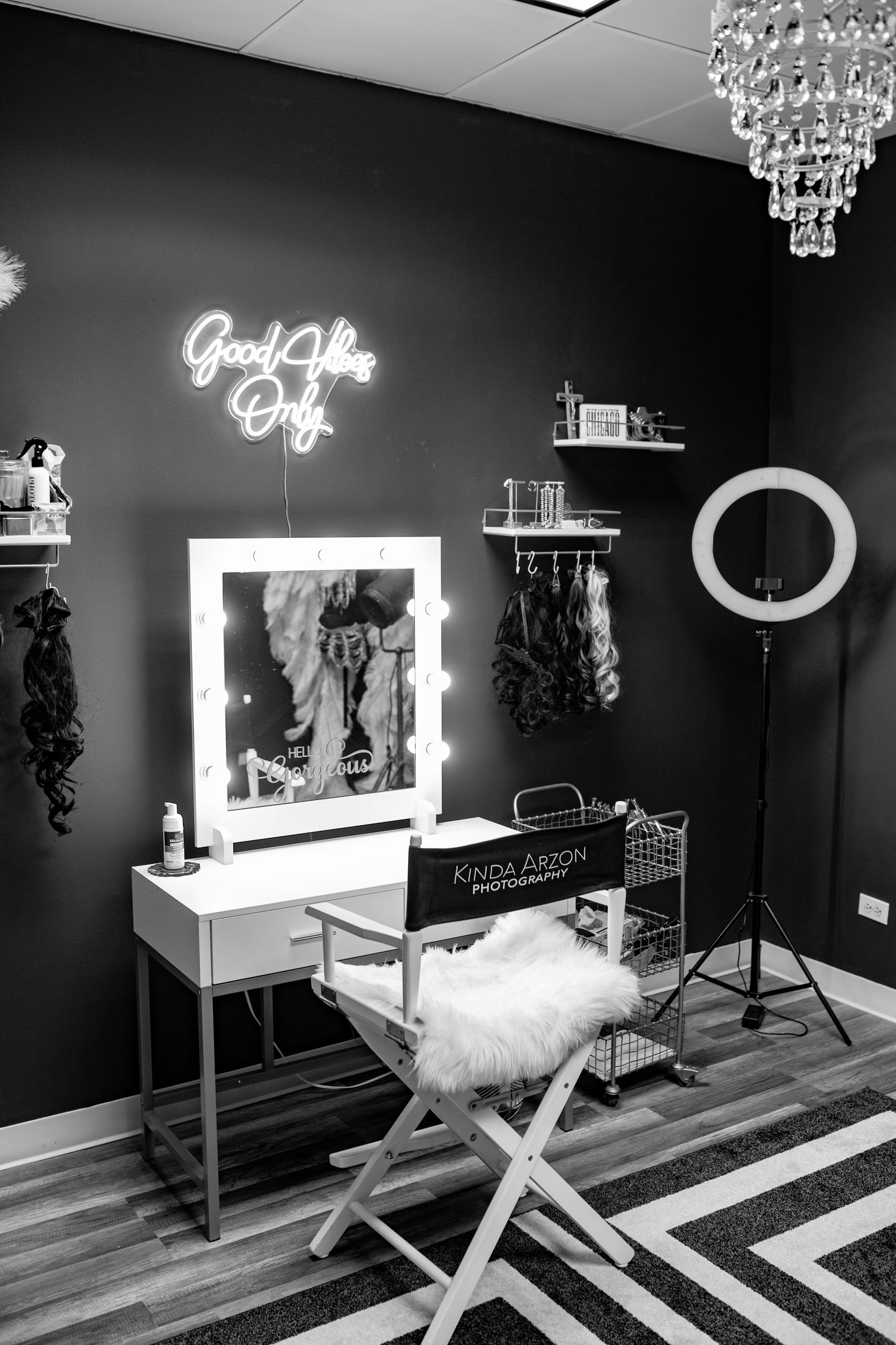 Kinda Arzon's private studio, conveniently located in Oak Brook, welcomes clients from all over the Chicagoland area and beyond . Take a step in the studio and instantly feel what it's like to be on a celebrity photoshoot, from the boutique setting and personalized attention to the beautiful natural light ambiance. No matter how comfortable or shy you feel in front of a camera, you'll feel at ease and at home, guaranteed. Let our stylists give you the royal treatment, complete with on-set touch ups, while Kinda works her magic bringing out your inner goddess in a natural way.